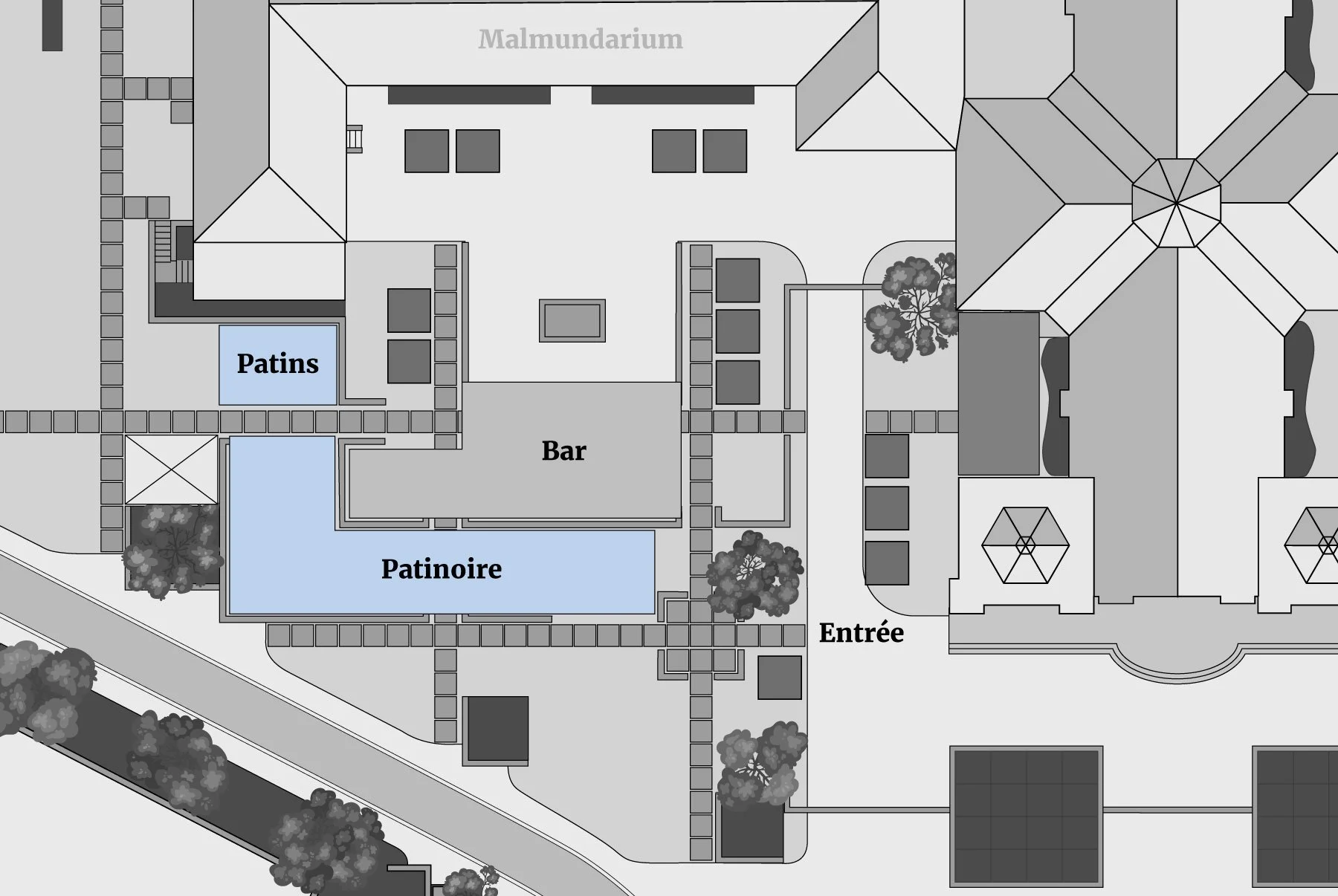La patinoire, en angle, de plus de 200m² , épouse le relief naturel de l’esplanade du Malmundarium.